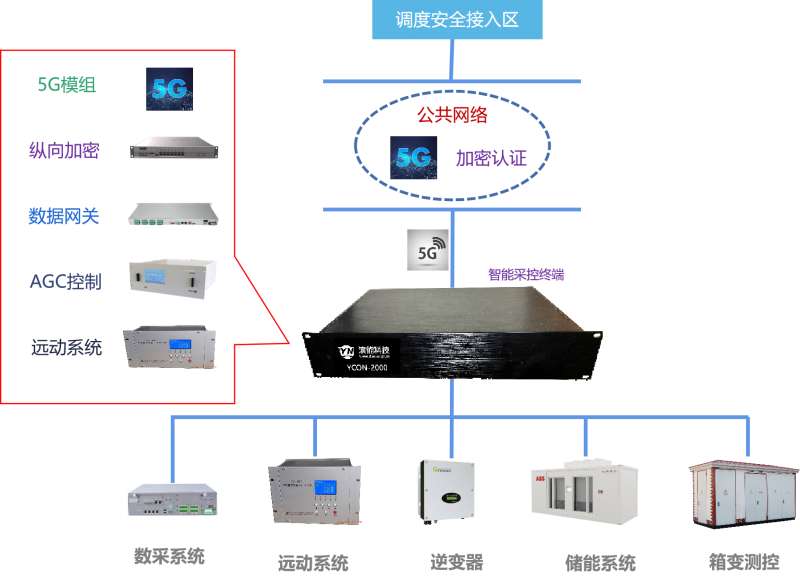 设备内置5G通信、纵向加密、数据采集、数据服务、规约转换、AGC控制系统、AVC控制系统等。